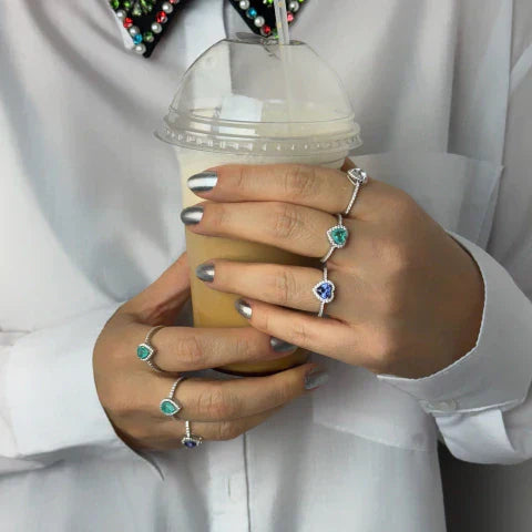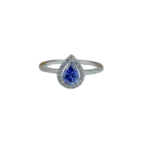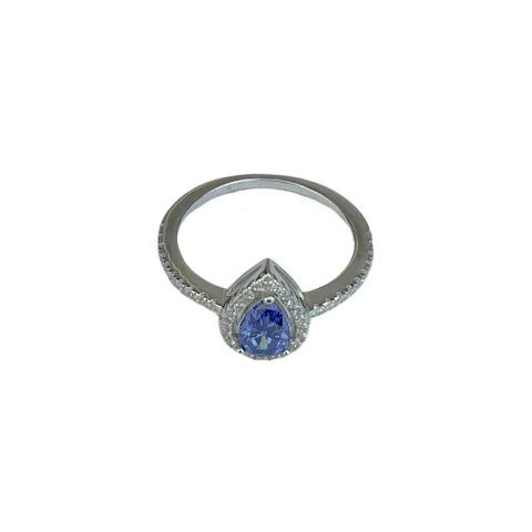 Anel prata 925 cravejado em microzircônias com pedra central em formato de gota.