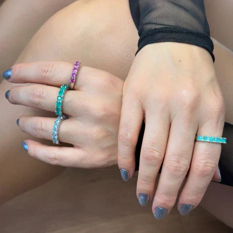 Anel em prata 925 com 8 pedras em zircônia fusion. Trata-se da fusão entre pedras naturais e cristais nobres, o que faz com que elas possuam um brilho diferenciado.