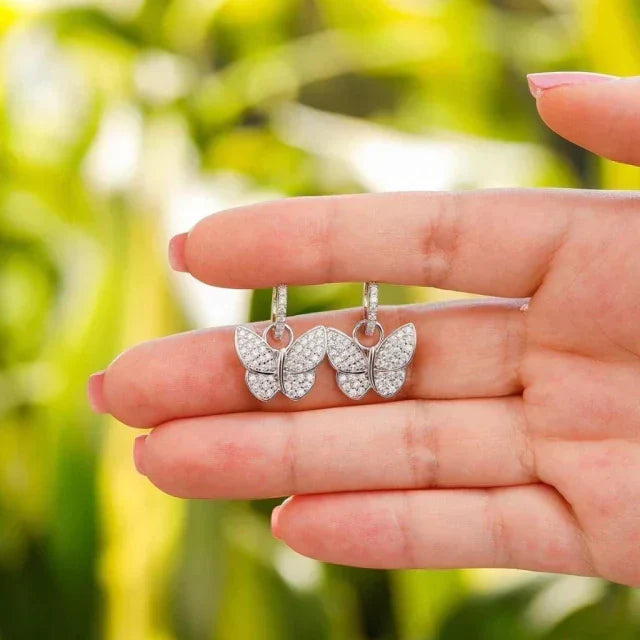 Brinco borboleta. Prata 925 com banho de ródio. Micro cravejado com zircônias. Pingente pode ser removido da argolinha, delicadeza e suavidade para sua orelha.