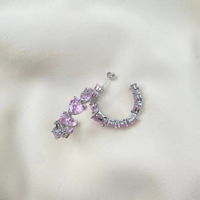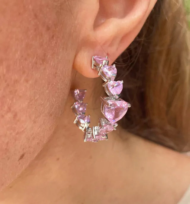 Brinco de argola cravejado com zircônia rosa em forma de coração de varios tamanhos e com banho de ródio.