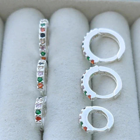 Trio de Argola Cravejada Colorido de Prata 925, vem com 3 peças coloridas e lindas, com acabamento perfeito e com 2mm de espessura, o modelo tamanho P apresenta 8 milímetros, o modelo M apresenta 12 milímetros e o modelo tamanho G apresenta 13 milímetros, vem com o fecho de encaixe, além de ser feito com um material de excelente qualidade e durabilidade.