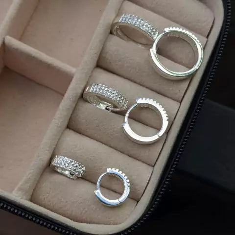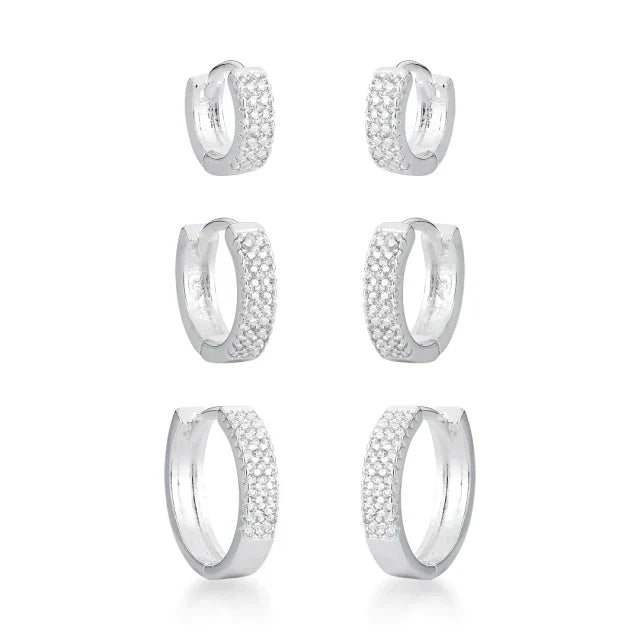 Trio de Brinco Argola Abaulada de Prata 925, vem com 3 peças lindas, com acabamento perfeito, 3 fileiras cravejadas e com 3,5 mm de espessura, o modelo tamanho P apresenta 10 milímetros, o modelo M apresenta 13 milímetros e o modelo tamanho G apresenta 16 milímetros tem a largura de 3 milímetros, vem com o fecho de encaixe, além de ser feito com um material de excelente qualidade e durabilidade.