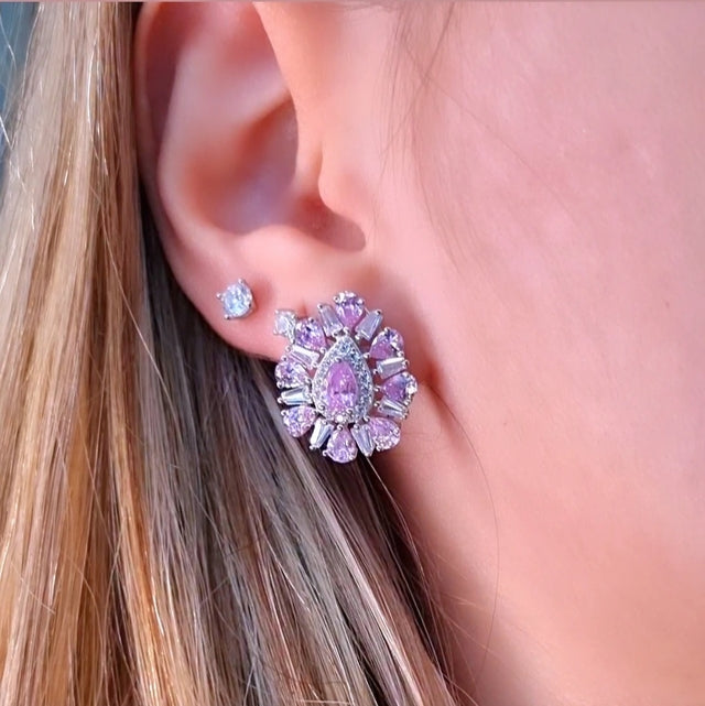 Essa peça é um clássico da joalheria mundial com toques de exclusividade que você só encontra na fabricação própria. Brinco em Prata 925 com banho de ródio em lapidação gotas. Zircônias Safira Rosa com moldura em zircônias brancas e baguetes.