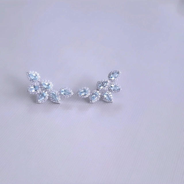 Brinco Ear Cuff confeccionado em Prata 925 com banho de ródio, em lapidação gotas com zircônias na cor água marinha e moldura em zircônias brancas.