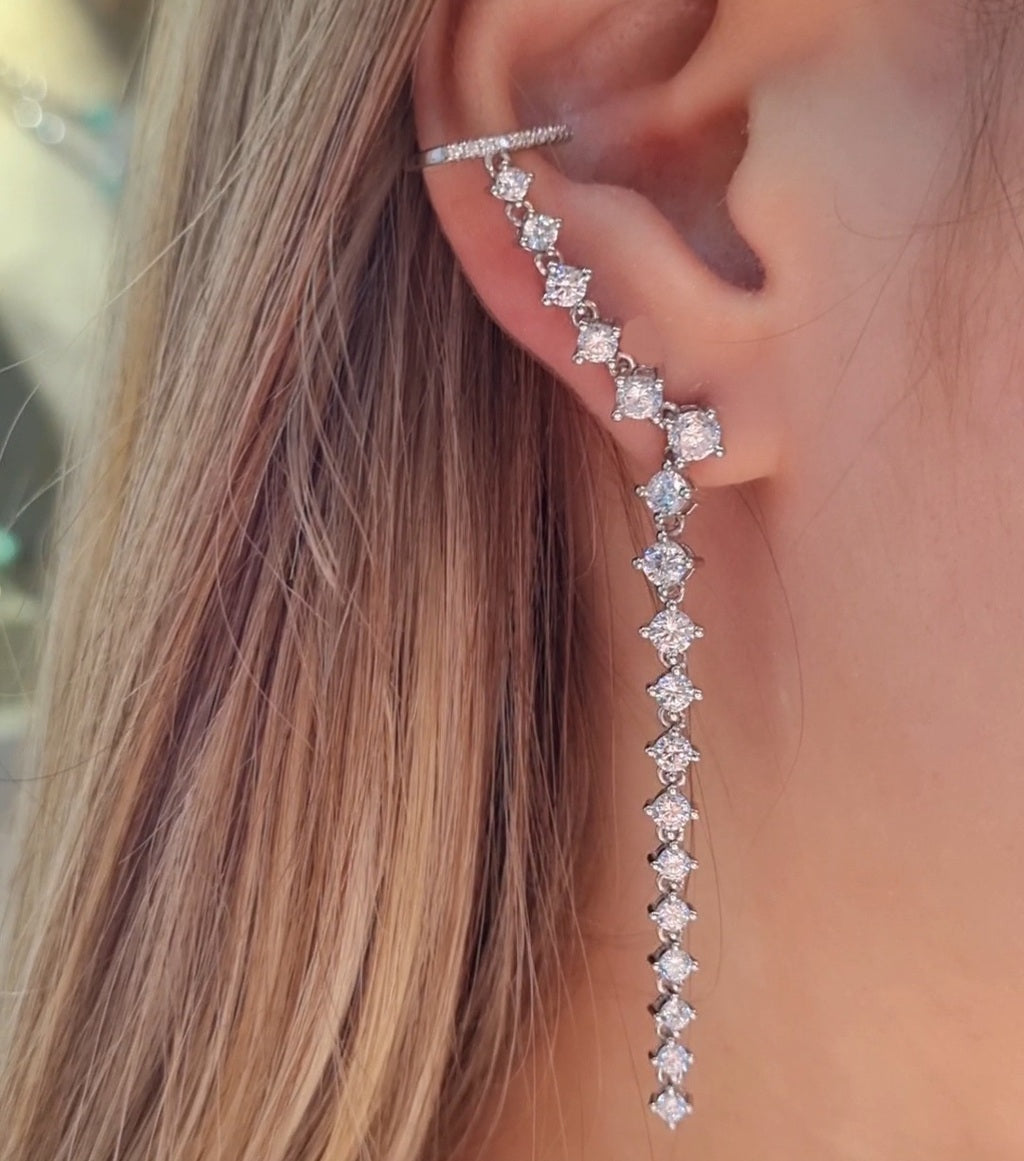 Brinco confeccionado em Prata 925 com banho de ródio, com zircônias brancas em degradê (4 mm / 3 mm / 2 mm).