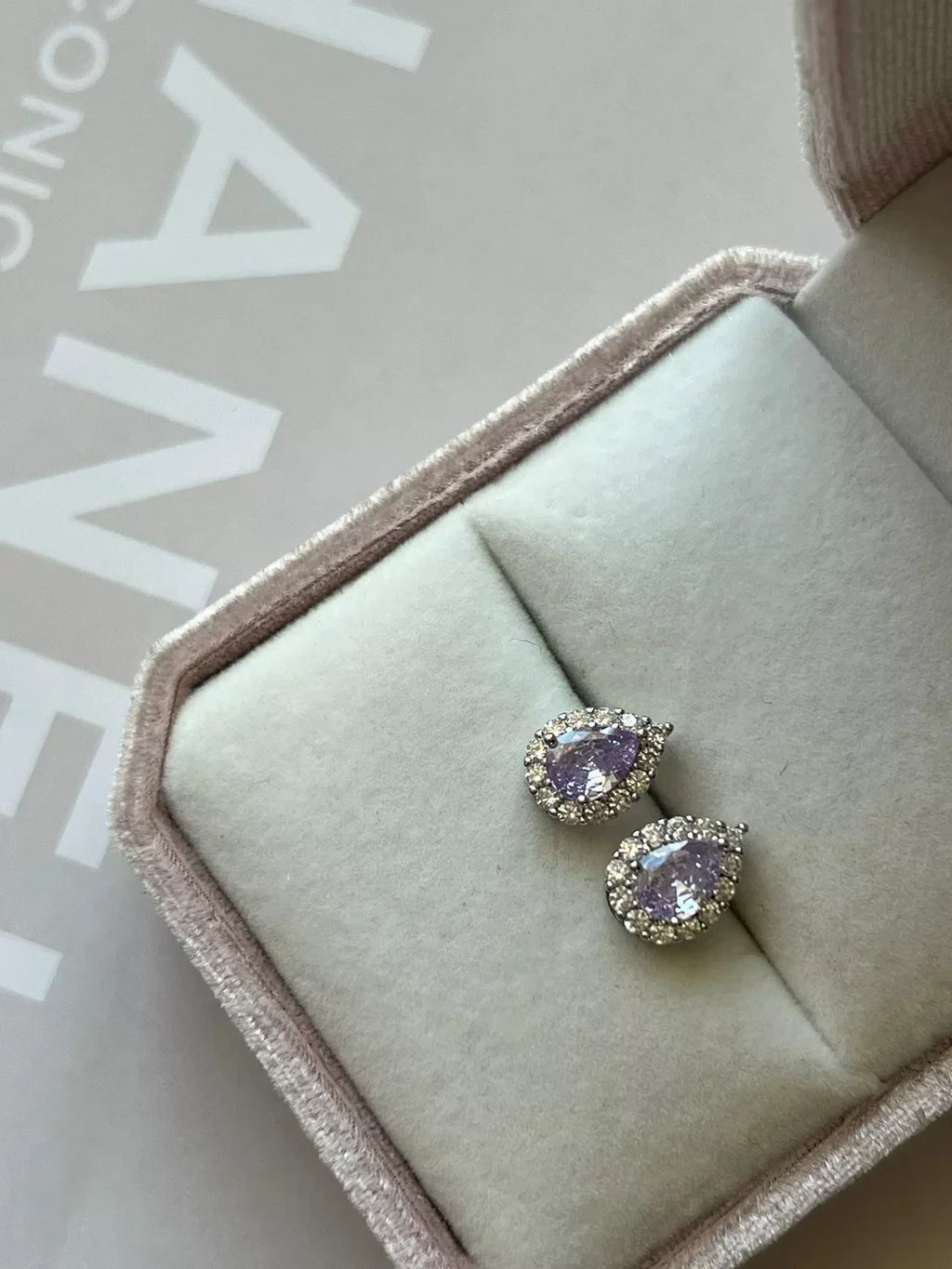 Brinco Gotinha com Zircônia Cristal e Lilás em Prata 925 de Ródio Branco