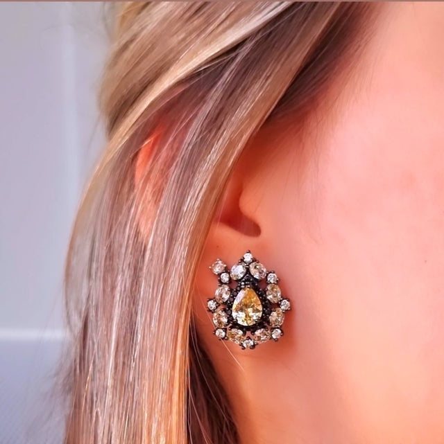 Brinco em Prata 925 com banho de ródio negro, em lapidação gota, com zircônias na tonalidade Yellow Fancy.