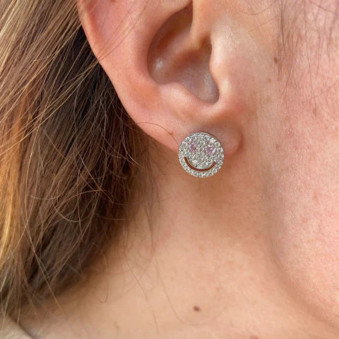 Brinco smile cravejado com zircônia branca e rosa e com banho de ródio.