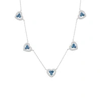 Colar modelo gargantilha confeccionado em Prata 925 com banho de ródio, corrente modelo elo português com 5 pingentes fixos na corrente design corações cravejados com detalhe central em três zircônias e moldura de cravação em zircônias incolores.