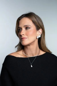Colar confeccionado em Prata 925 com banho de ródio, corrente em elo português e pingente em formato de gota inteiro cravejado vazado atrás M.