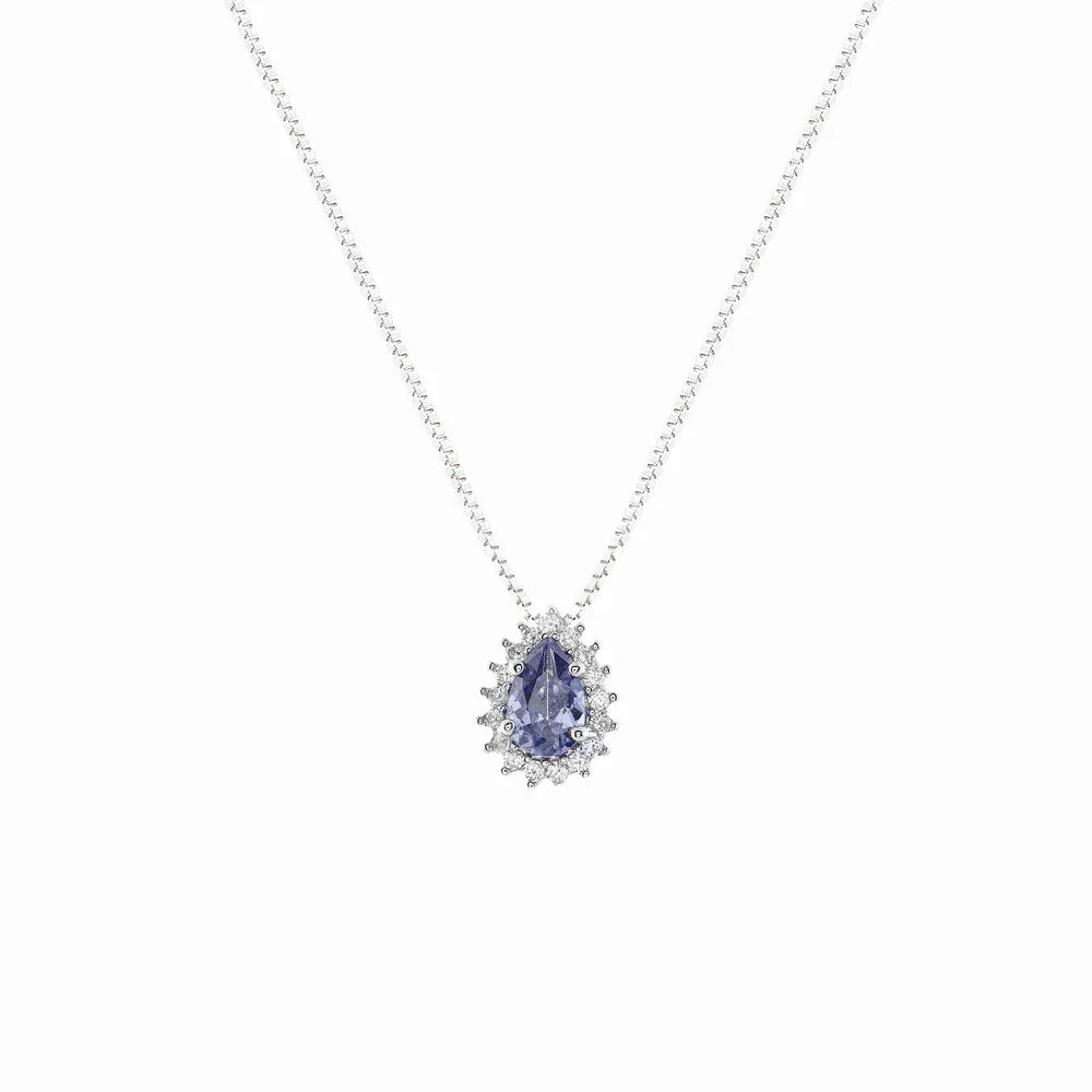 Colar em prata 925 com banho de ródio, corrente veneziana e pingente móvel tanzanita com borda princesa de zircônias incolores.