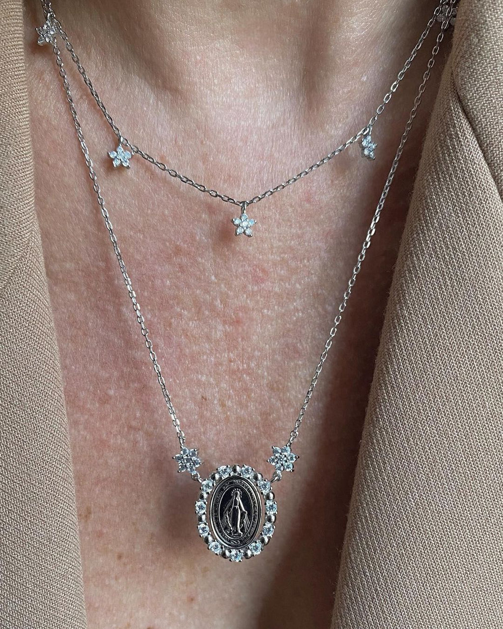 Envolva-se na proteção e na beleza da Nossa Senhora das Graças com este deslumbrante colar em Prata 925. Uma peça icônica que une devoção e sofisticação, perfeita para expressar sua fé de forma elegante e discreta.