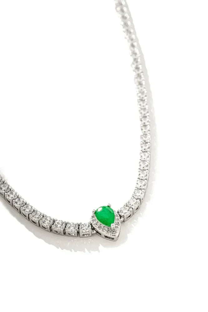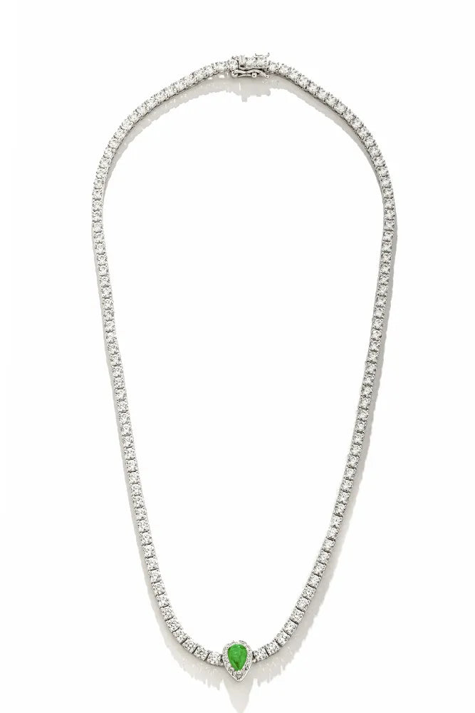 Colar Riviera Com Zircônias De 3Mm Na Cravação 4 Garras Com Pingente Em Formato De Gota Em Zircônia Esmeralda E Micro Zircônias Brancas Ao Redor.