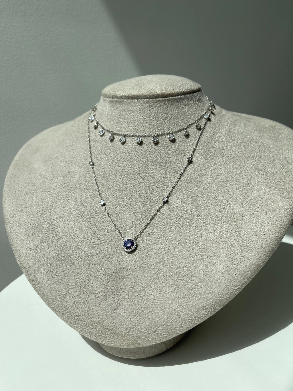 Conjunto de colar e brinco no formato redondo, com corrente modelo Tiffany (Zircônias na corrente). Pedra: Tanzanita. Corrente: 40cm + 10cm de Extensor. Prata 925