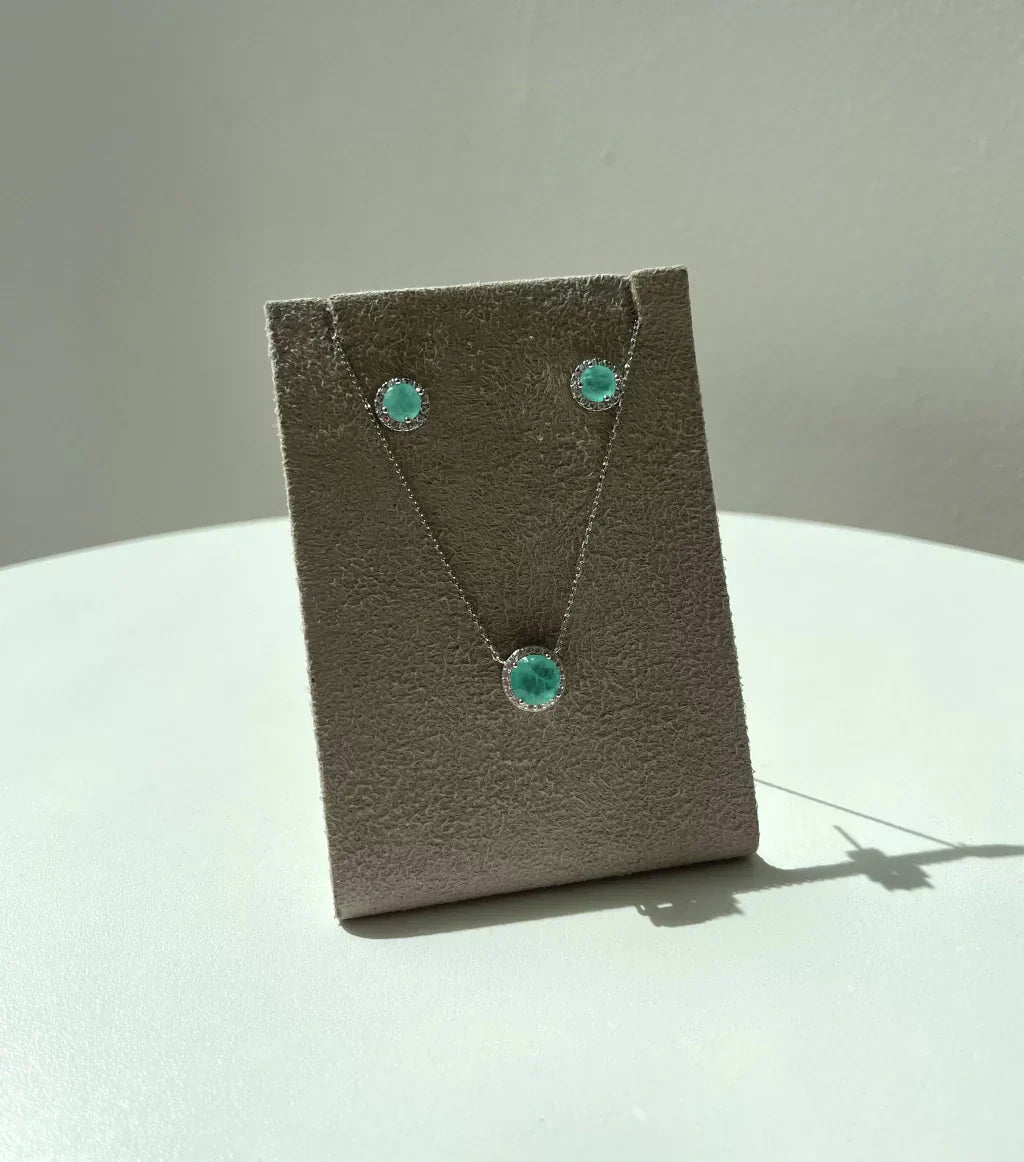 Conjunto Bia, formato redondo, cravejado em micro zircônias, na pedra Esmeralda Colombiana. Corrente: 40cm + 10cm de Extensor. Prata 925.