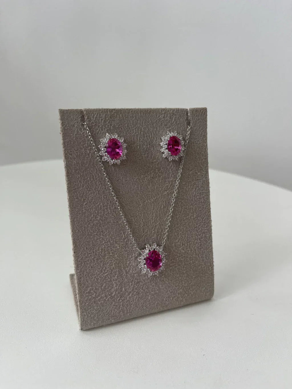 Conjunto oval, com cravação lateral em zircônias e pedra central no safira pink. Corrente: 40cm + 10cm de Extensor. Prata 925