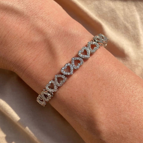 Pulseira de corações cravejados com zircônia e com banho de ródio.