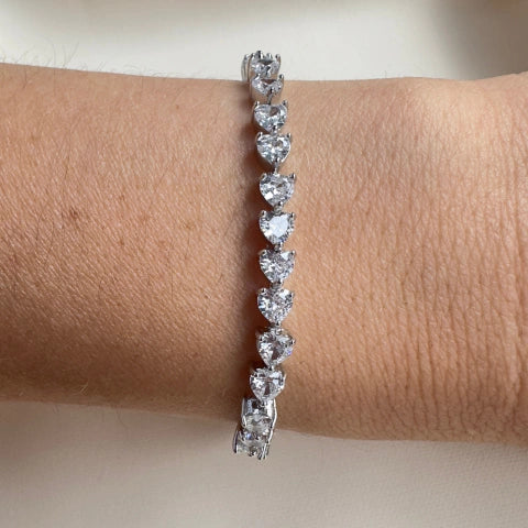 Pulseira riviera cravejado com zircônia em forma de coração de 3mm e com banho de ródio.