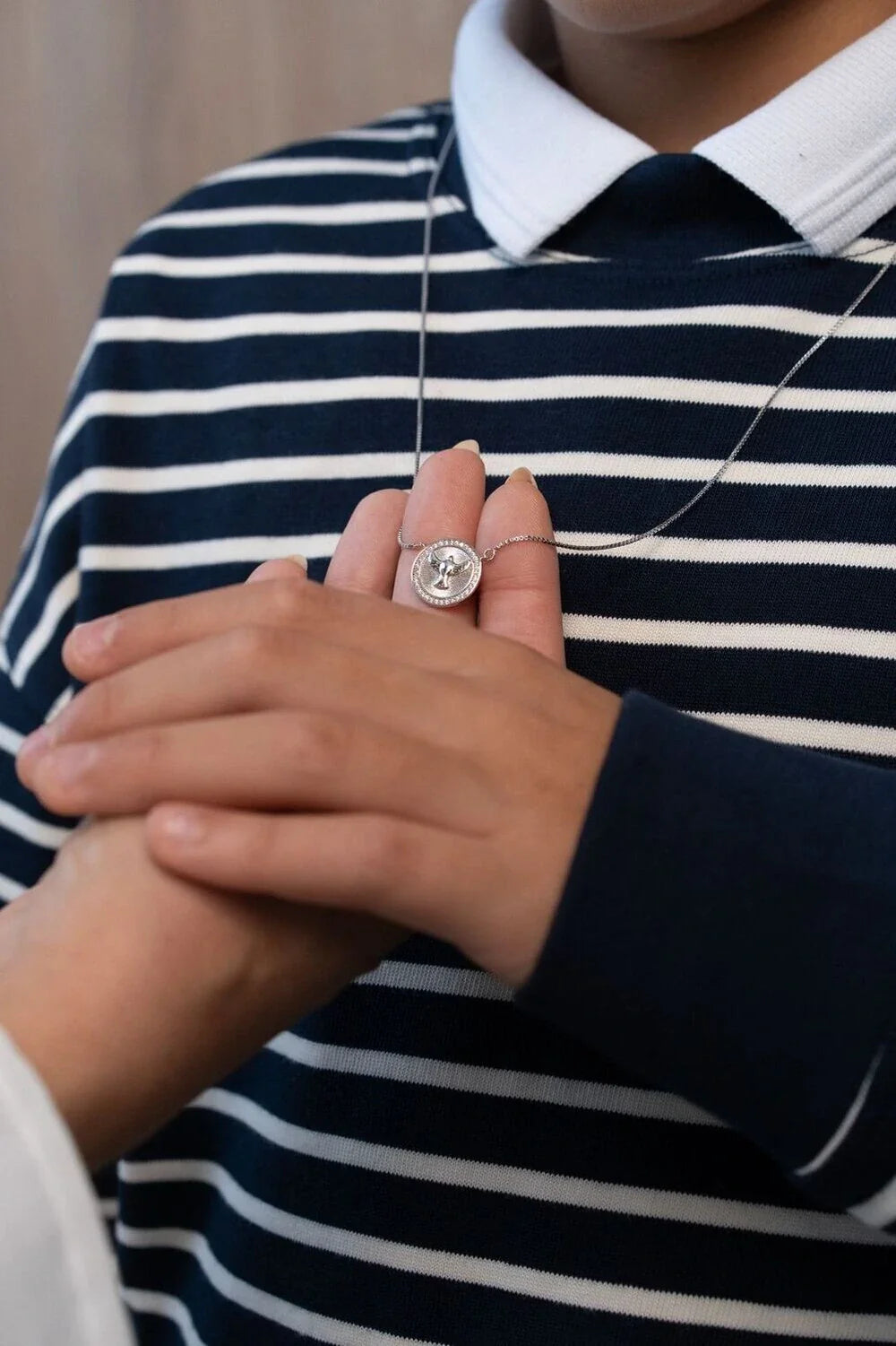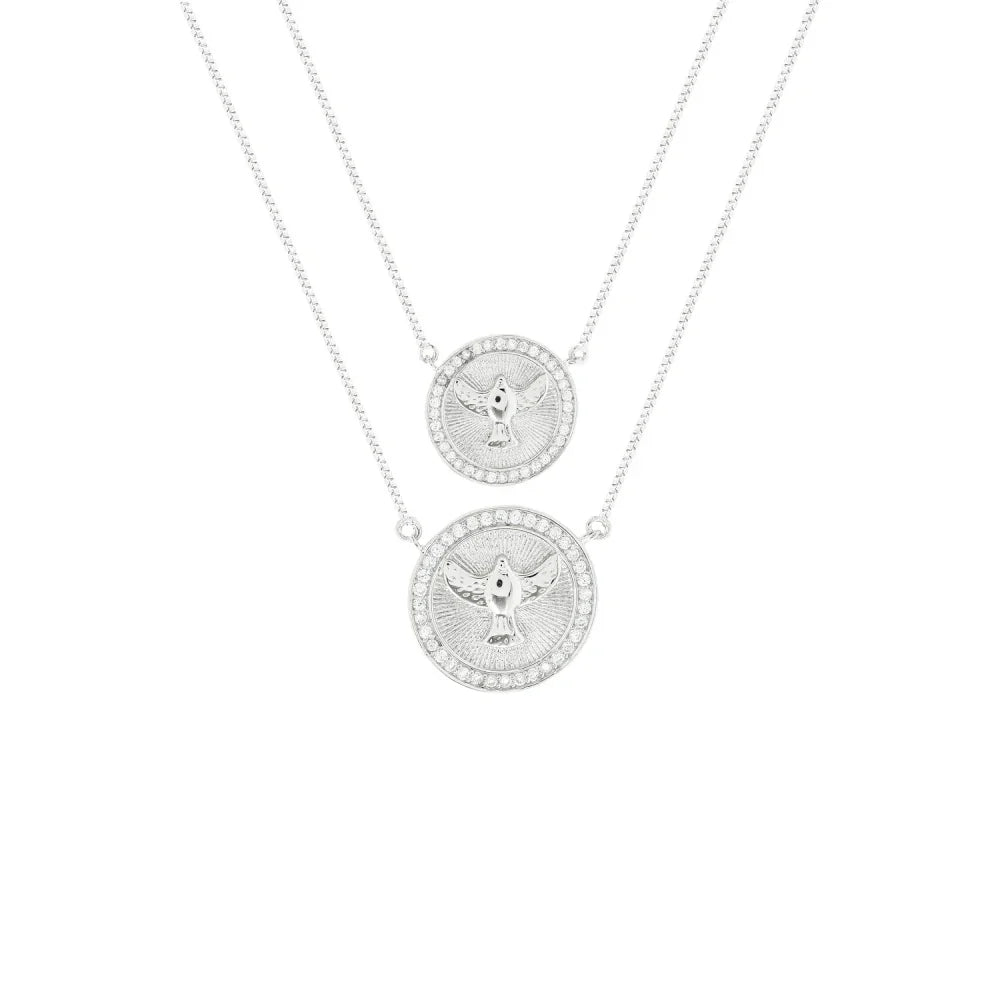 Colar no modelo escapulário Divino Espírito Santo, confeccionado na Prata 925, no banho de ródio branco, com borda cravejada em Zircônia incolor.